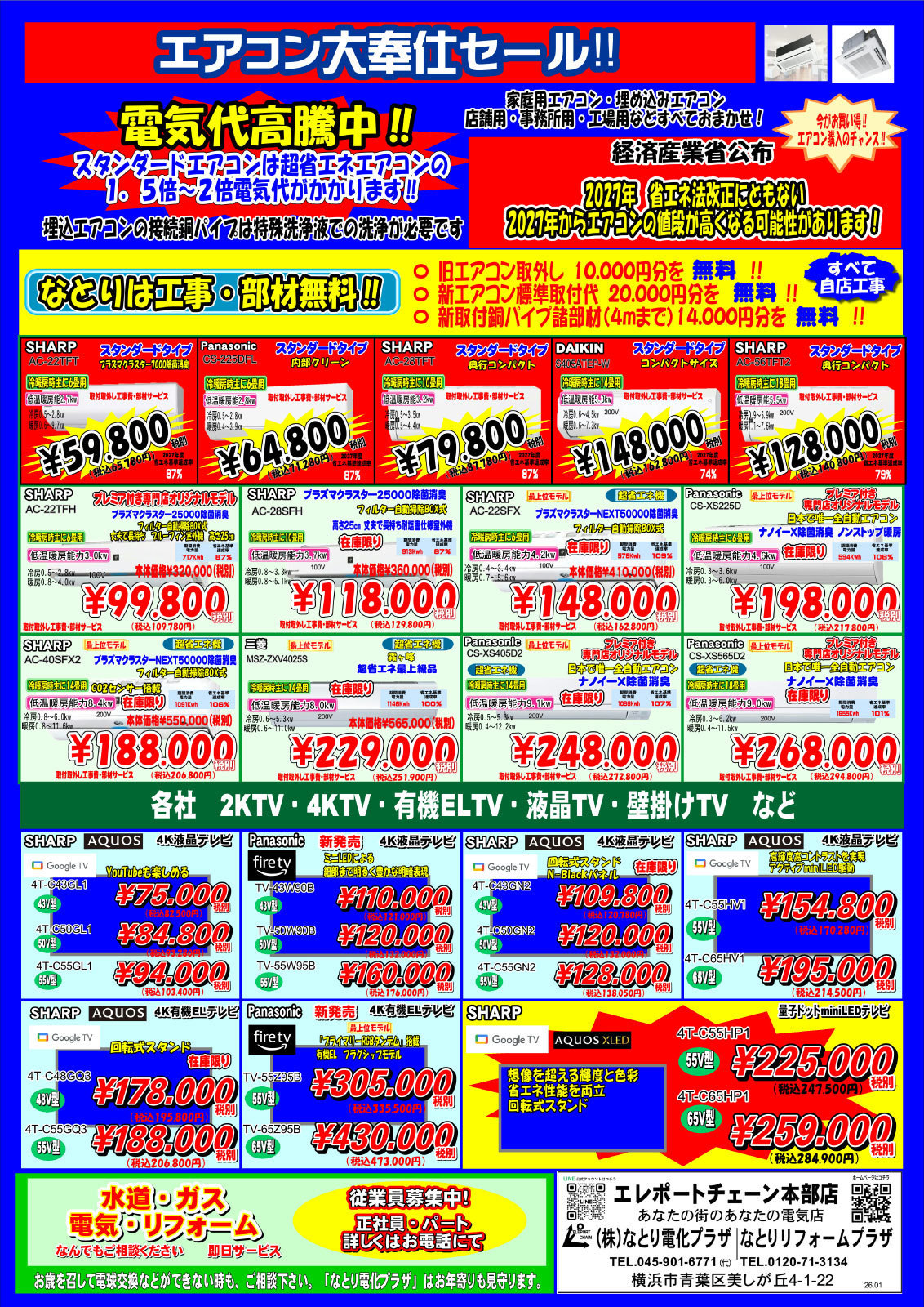 エアコン大奉仕セール!なとりは工事・部材無料です✨家庭用エアコン・埋め込みエアコン・店舗用・事務所用・工場用など、すべておまかせください。